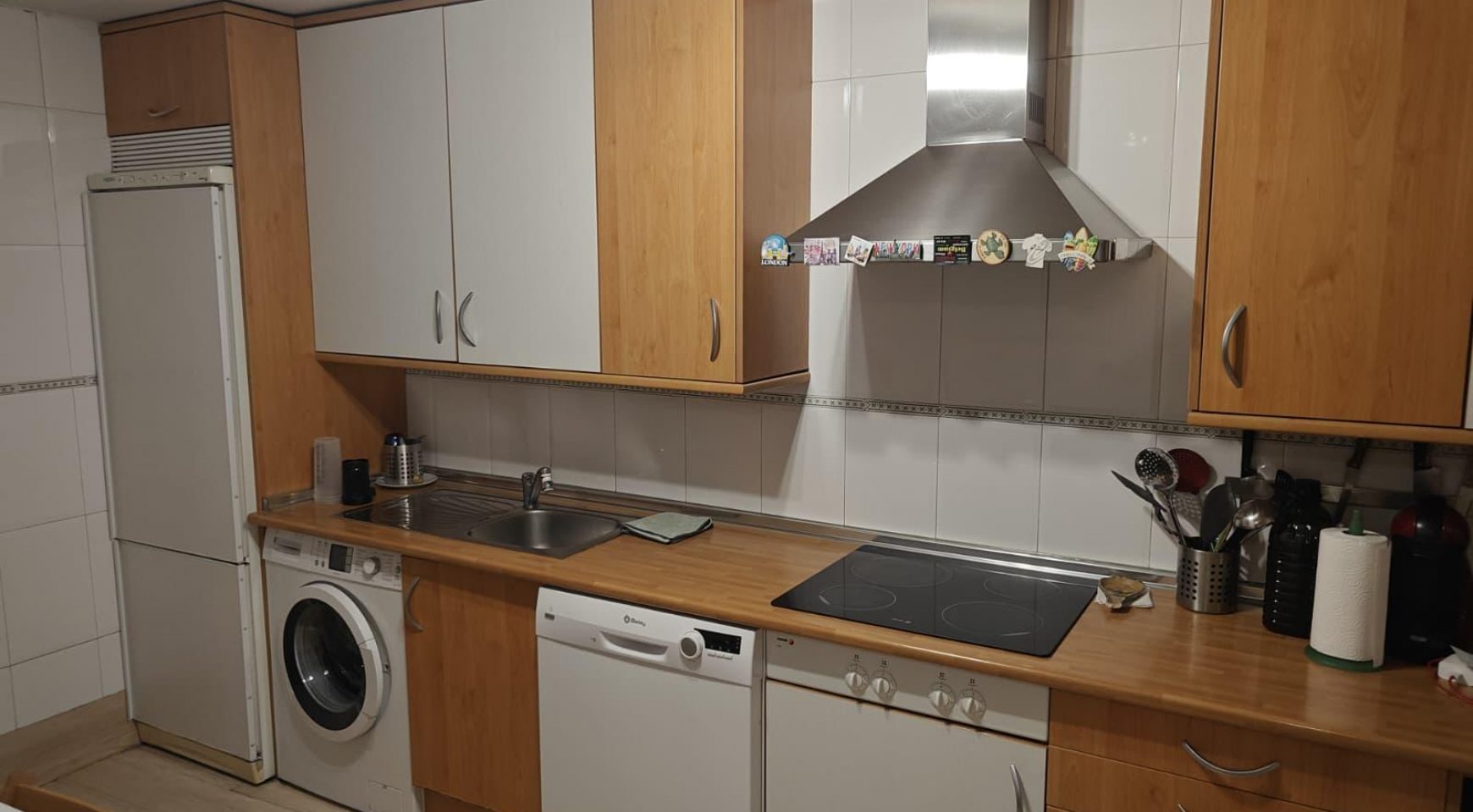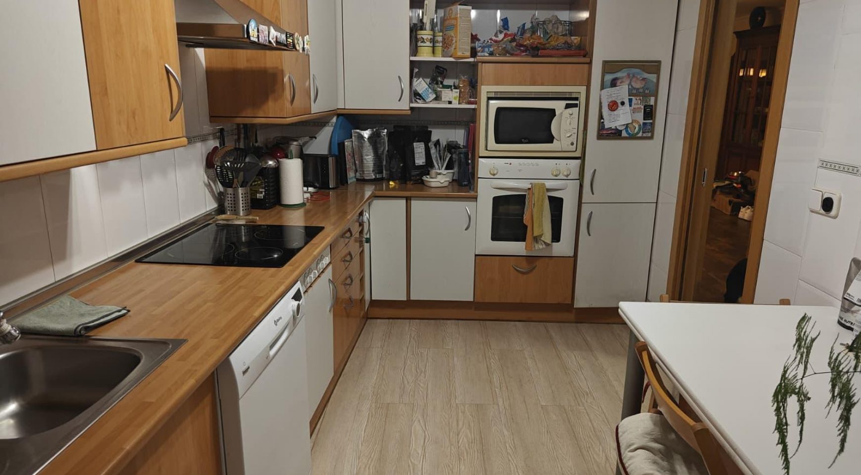 Planta baja: amplio y luminoso salón-comedor con salida a patio exterior, cocina totalmente amueblada y equipada con electrodomésticos, y aseo de cortesía.