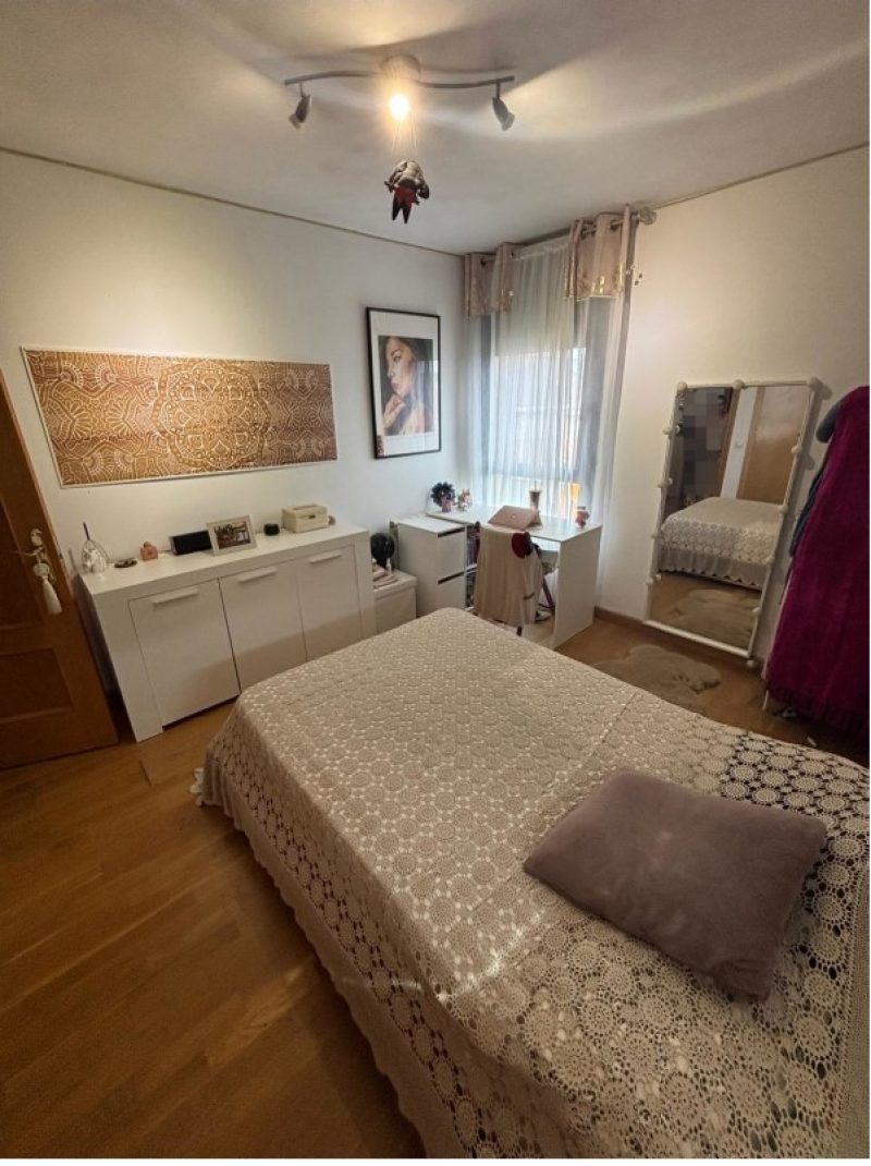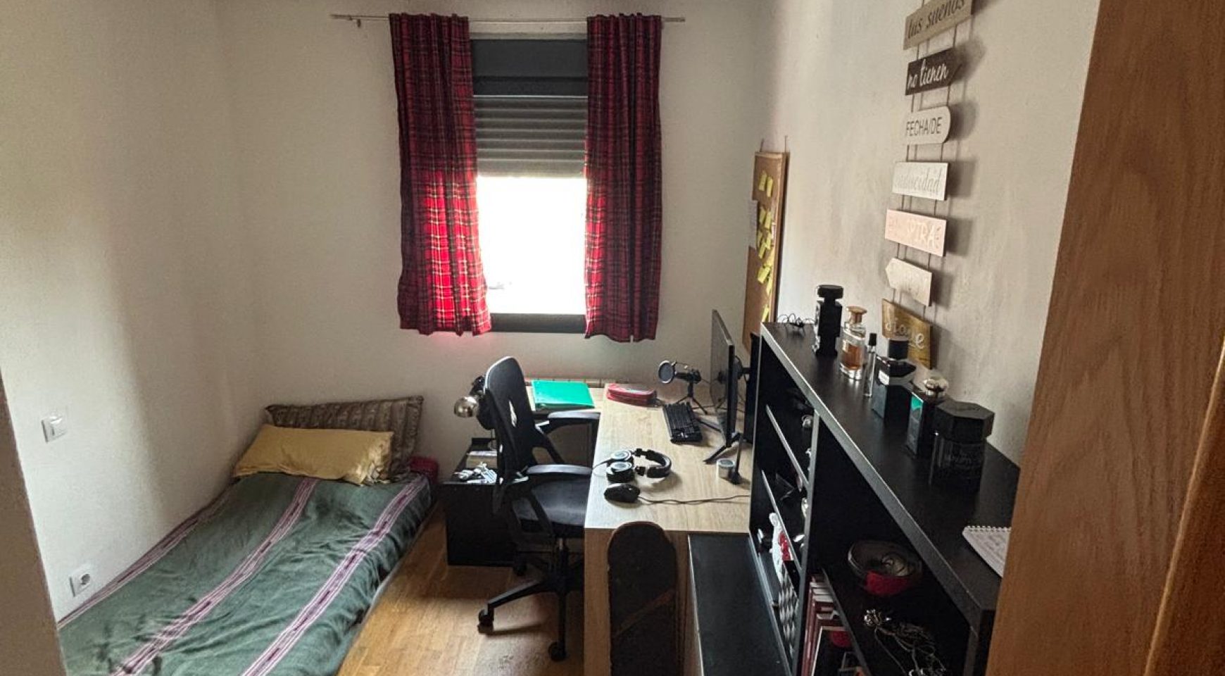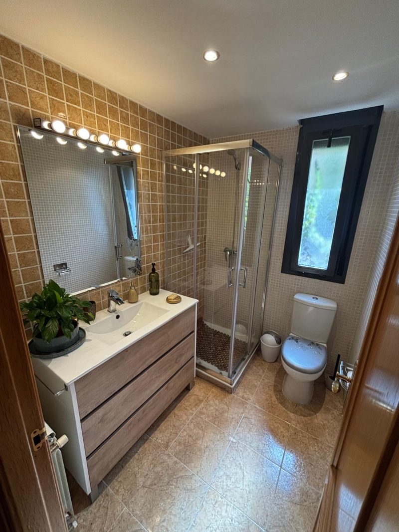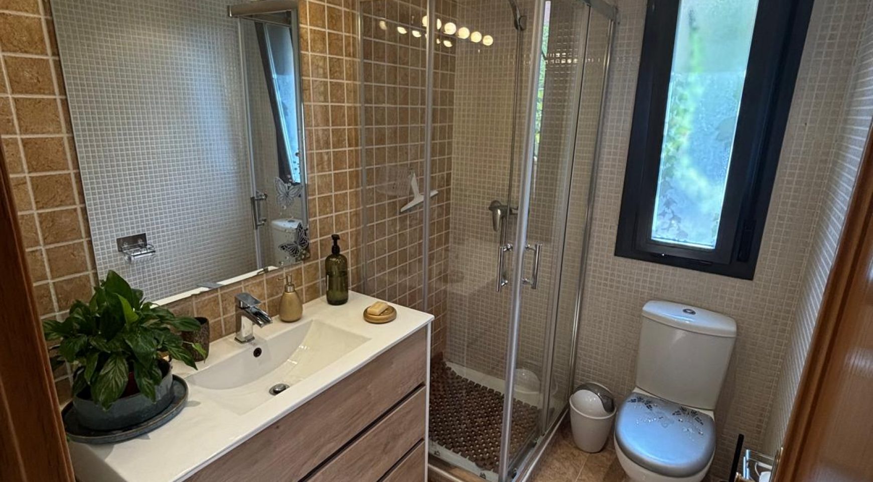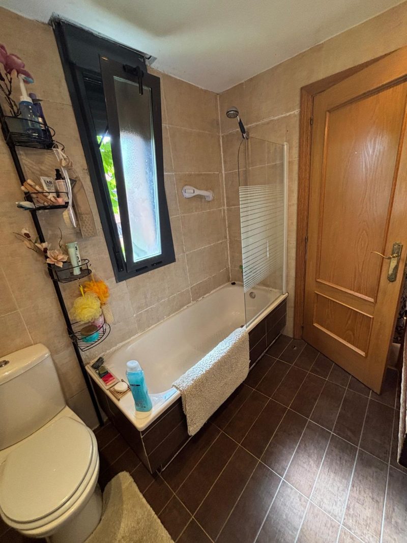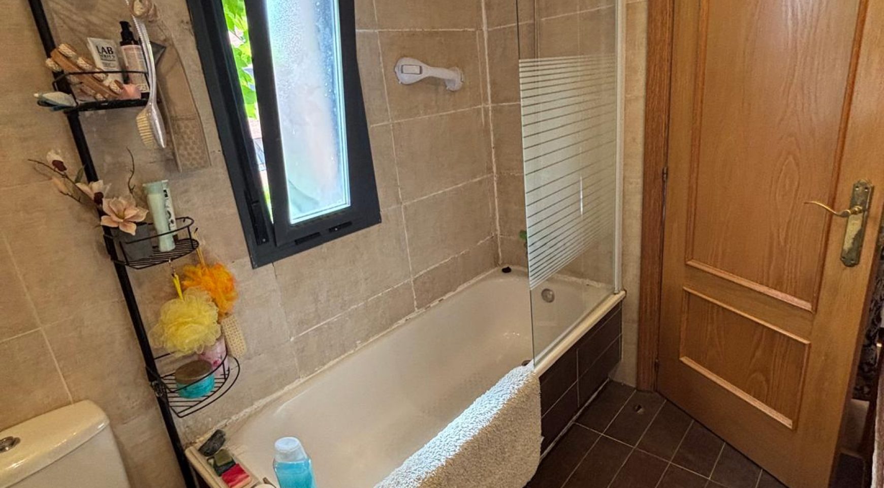 1 dormitorio y 1 baño completo con ducha y ventana.